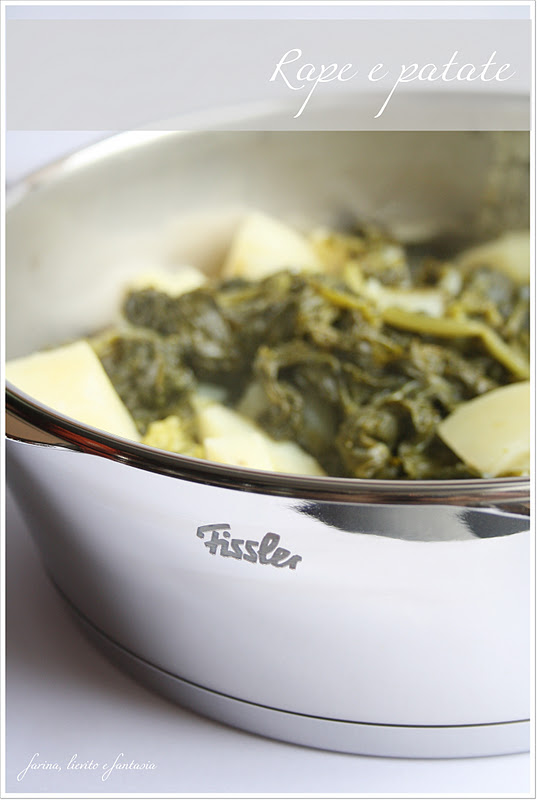 Come prima cosa bisogna scaldare le rape, giusto una rapida sbollentata in quanto poi la cottura si completerà insieme alla patate. Successivamente sarà necessario cuocere le patate. Io ho utilizzato la pentola a pressione Fissler che in poco più di 10 min. mi ha consentito di cuocere le patate. In un’altra casseruola, soffriggere aglio, olio e peperoncino e aggiungervi le patate e le rape. In questa fase gli ingredienti si amalgameranno e insaporiranno.