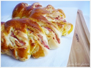Poggiare il rotolo su carta forno e con le forbici tagliare delle strisce lungo questo rettangolo, torcerle verso l’alto fino ad evidenziare il ripieno. Dare alla pasta la forma di mezza luna. Pennellare con uovo battuto e far  lievitare 30/40 minuti. Cuocere poi a 180° per 20/25 minuti. Servire freddo.